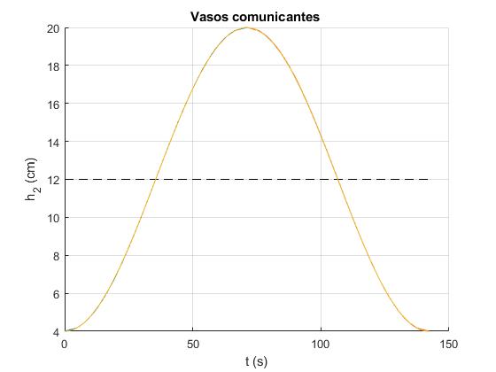 En esta página, se considera que el líquido que se vierte en los recipientes es ideal, el estado de equilibrio no se alcanza. El líquido pasa de un recipiente hacia el otro y vicersa, oscilando entre alturas constantes, h02 y 2h-h02 en el recipiente de la derecha.