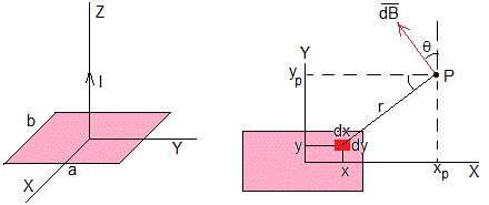 Consideremos una corriente rectilínea indefinida de sección rectangular de lados a y b, de intensidad I uniformemente distribuida en la sección. Vamos a calcular las componentes del campo magnético producido por dicha corriente en puntos P exteriores