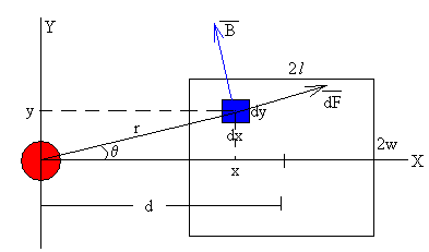 Vamos a calcular la fuerza que ejerce dicho campo sobre una corriente rectilínea indefinida de sección rectangular de dimensiones 2l (largo)y 2w (ancho), distante d.