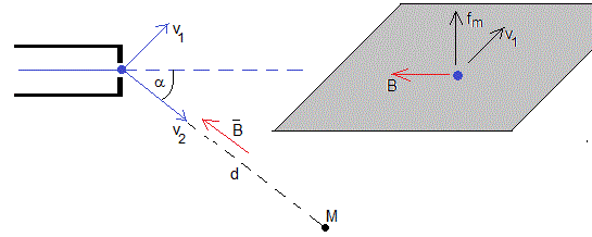 En primer lugar, consideramos que el campo magnético es perpendicular a plano formado por el haz y el blanco M (el plano del dibujo)