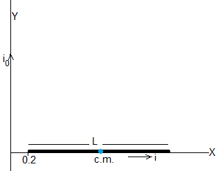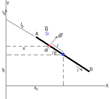 Por una porción de corriente AB de longitud L y masa m circula una corriente de intensidad i, puede deslizar sin rozamiento por el plano horizontal XY debido a las fuerzas que ejerce un campo magnético no homogéneo producido por una corriente rectilínea indefinida i0 situada en el eje Y.