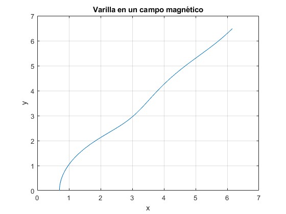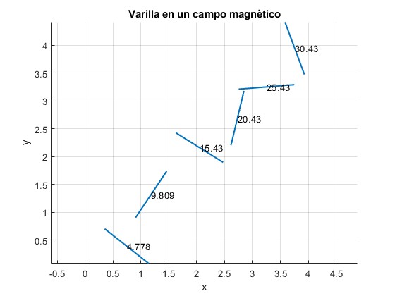 En un instante t la posición del centro de la varilla es (xc, yc) y forma un ángulo θ con el eje X. Se tomarán positivos los ángulos en el sentido de las agujas del reloj