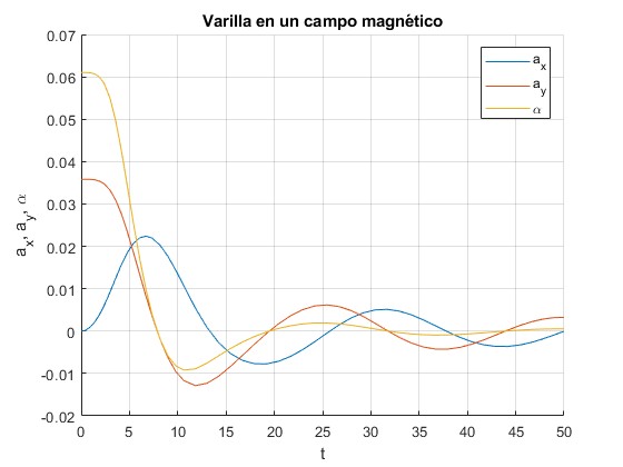 Representamos las componentes de la aceleración del centro de masas dvx/dt, dvy/dt y la aceleración angular de rotación α=dω/dt alrededor del eje perpendicular que pasa por el c. m. en función del tiempo t
