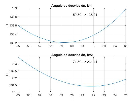 Calculamos el ángulo de desviación mínima correspondientes al color verde, λ=530 nm, para k=1 y para k=2 (reflexiones internas)