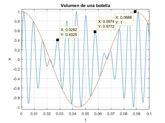 el periodo de varias oscilaciones (cuatro). El periodo P0 de una oscilación (en color azul), P0=(0.0574-0.0282)/4=0.0073 s