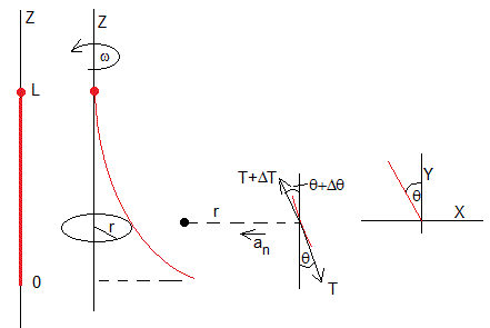 Consideremos una cuerda de longitud L y masa m se sujeta por su extremo superior z=L a un eje vertical que se hace girar con velocidad angular ω.