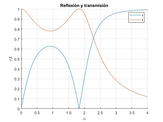 La diferencia de fase entre la onda incidente y reflejada es π/2 cuando α→0. Tiende hacia π cuando α se hace grande, mientras que la onda transmitida tiende hacia π/2