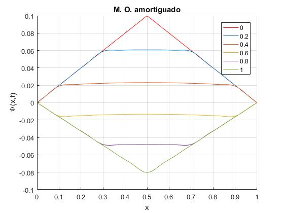 Se desplaza el punto medio de la cuerda una distancia h=0.1 en el instante t=0 y a continuación, se suelta.