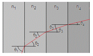 La ley de la refracción se escribe, nsinθ=n0 en este medio estratificado. Donde n y θ son funciones de x