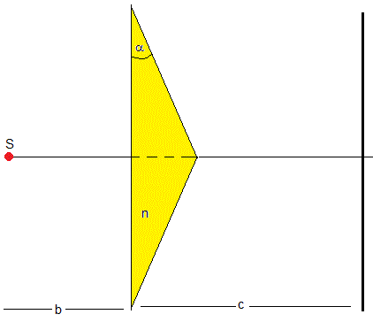 En la figura, se muestra el biprisma de ángulo α hecho con un material transparente de índice de refracción n. Dista b de la fuente de luz S y c de la pantalla