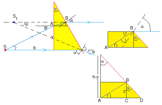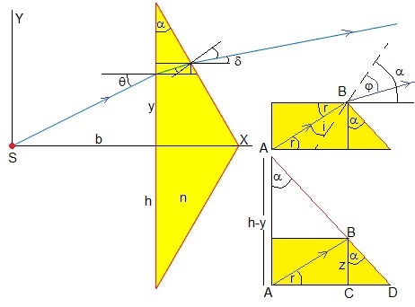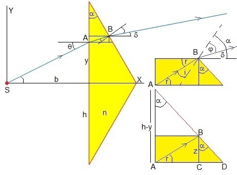 Dibujamos el camino seguido por un rayo que parte de S y llega a la superficie de separación a la altura y del biprisma