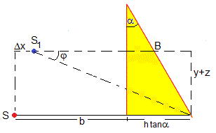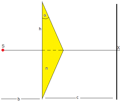 En la figura, se muestra el biprisma de ángulo α hecho con un material transparente de índice de refracción n. Dista b de la fuente de luz S y c de la pantalla. El vértice del biprisma dista h del eje de simetría X