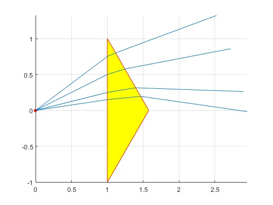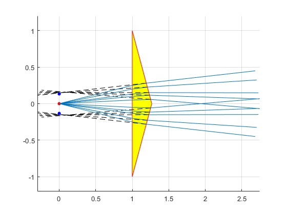 alfa=pi/12; %ángulo del prisma n=1.5; %índice de refracción h=1; %altura del prisma b=1; %distancia a la fuente xx=[b, b+h*tan(alfa),b, b]; yy=[h, 0,-h, h]; hold on fill(xx,yy,'y') plot(xx,yy,'r') plot(0,0,'ro','markersize',4,'markeredgecolor','r','markerfacecolor','r') y=b*tan((n-1)*alfa); th=atan(y/b); line([0,b],[0,y]) r=asin(sin(th)/n); z=(h-y)*tan(alfa)*tan(r)/(1+tan(r)*tan(alfa)); line([b,b+(h-y-z)*tan(alfa)],[y,y+z]) phi=asin(n*sin(alfa-r)); line([b+(h-y-z)*tan(alfa), b+(h-y-z)*tan(alfa)+1.5*cos(alfa-phi)], [y+z, y+z+1.5*sin(alfa-phi)]) line([b+(h-y-z)*tan(alfa), b+(h-y-z)*tan(alfa)+1.5*cos(alfa-phi)], [y+z, y+z+1.5*sin(alfa-phi)]) line([b+(h-y-z)*tan(alfa), b+(h-y-z)*tan(alfa)-1.5*cos(alfa-phi)], [y+z, y+z-1.5*sin(alfa-phi)],'lineStyle','--','color','k') plot(0,(n-1)*b*alfa,'bo','markersize',4,'markeredgecolor','b', 'markerfacecolor','b') hold off grid on axis equal