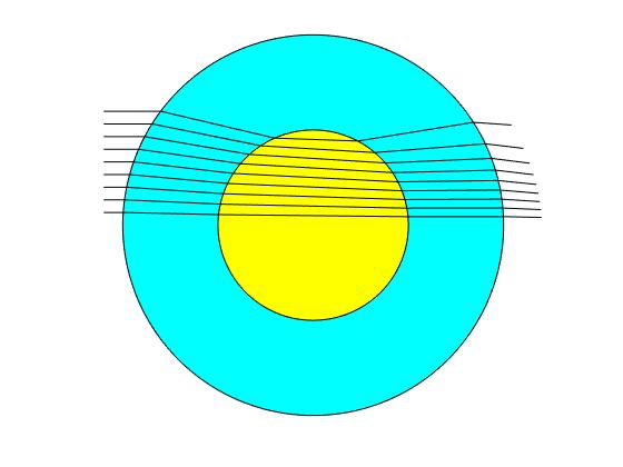 R=1; %radio exterior r=0.5; %radio interior n0=1.5; %índice de refracción del tubo hold on x=(0:360)*pi/180; fill(R*cos(x),R*sin(x),'c') plot(R*cos(x),R*sin(x), 'k') fill(r*cos(x),r*sin(x),'y') plot(r*cos(x),r*sin(x), 'k') th=asin(0.8/R); %ángulo incidente line([-R-0.1,-R*cos(th)],[R*sin(th),R*sin(th)],'color','k') phi=asin(sin(th)/n0); %refractado x2=R*cos(th-2*phi); y2=R*sin(2*phi-th); line([-R*cos(th),x2],[R*sin(th),y2],'color','k') %transmitido f=R*sin(th)/sin(2*(th-phi)); line([x2,f],[y2,0], 'color','k') line([-R*cos(th),0],[R*sin(th),0],'lineStyle','--', 'color','k') line([x2,0],[y2,0],'lineStyle','--', 'color','k') line([-1.1*R,1.1*R],[0,0],'color','k') hold off axis equal axis off grid on
