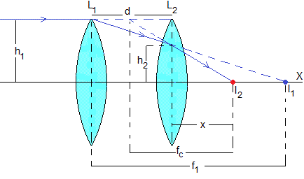Cuando la lente L2 está presente, I1 es el objeto para dicha la lente a una distancia s=-(f1-d), el signo - indica que I1 está detrás de L2, I2 es la imagen situada a s'=x. La ecuación de la lente delgada es
