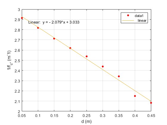 Representamos 1/fc en función de d. La recta que mejor ajusta tendrá una pendiente próxima a -1/(f1·f2)=-2 y una ordenada en el origen, 1/f1+1/f2=3
