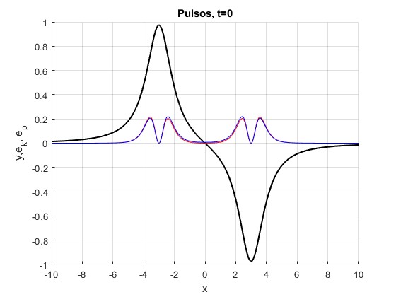 - La superposición de los dos pulsos y(x,t) en color negro, línea gruesa