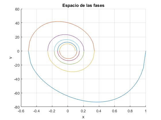El espacio de las fases nos muestra otra perspectiva del comportamiento del oscilador. Se representa el momento lineal (o la velocidad) v en el eje vertical y la posición del móvil x en el eje horizontal.