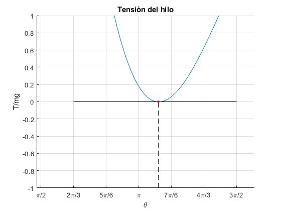 Para hacer los cálculos más sencillos, supongamos que partimos del origen θ0=0. La tensión del hilo es