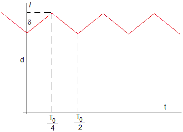 Hemos supuesto que el centro de masas del niño se eleva δ en la posición θ=0, (la longitud del péndulo pasa de d a d-δ) y desciende en los extremos θ0 de la oscilación, (la longitud del péndulo pasa de d-δ a d) en un tiempo muy corto comparado con el periodo T0 de la oscilación que supondremos constante e independiente de la amplitud θ0