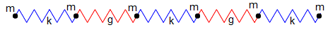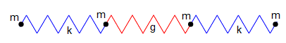 Vamos a estudiar el caso particular de un sistema formado por n/2 pares de partículas de masa m. Las dos partículas están unidas por muelles de constante k (en color azul). Los pares están unidos por muelles de constante g (en color rojo)