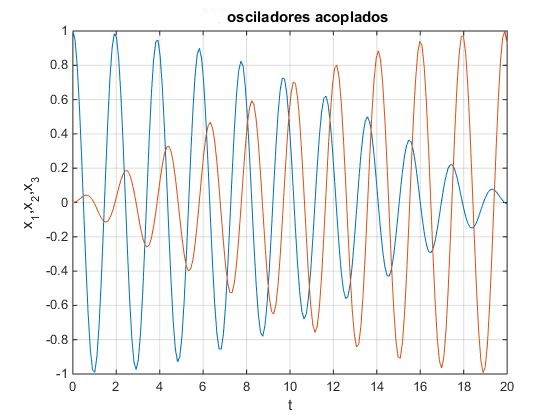 k1=10; k2=0.5; k3=10; m1=1; m2=1; K=[(k1+k2),-k2;-k2,(k2+k3)]; %sistema de dos partículas M=[m1,0;0,m2]; .... %condiciones iniciales x0=[1;0]; xp0=[0;0]; ....