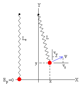 En la situación inicial, t=0, la partícula unida al muelle elástica se libera (v=0) en la posición (x0, y0). Situamos el nivel cero de energía potencial Ep=0, en la posición de la partícula cuando se encuentra en equilibrio, tal como se muestra en la figura.