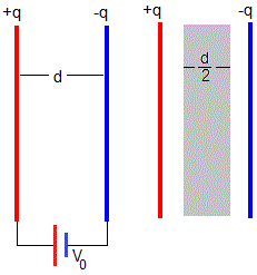 Segunda figura: Se desconecta el condensador de la batería y se introduce un dieléctrico de constante k=2 que llena completamente el espacio entre las placas. Calcular la capacidad C, la carga q, la diferencia de potencial entre las placas y la energía U del condensador.
