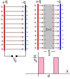 5.- Un condensador plano paralelo consiste en dos placas grandes de área S separadas una distancia pequeña d. Se conectan las placas a una batería que mantiene una diferencia de potencial constante V0 entre las dos placas. Despreciamos el efecto de los bordes del condensador, de modo que el campo eléctrico se considera que es perpendicular a las placas