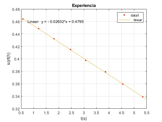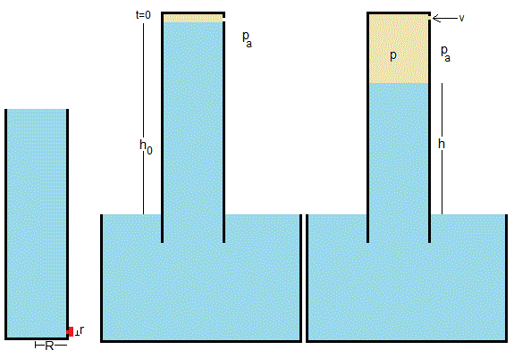 En el instante t=0, se quita el tapón que cierra el orificio y el aire entra en el recipiente debido a la diferencia de presión entre el interior del recipiente p y la presión atmosférica, Pa=101 300 Pa en el exterior. Como consecuencia, el nivel h de agua en el tubo disminuye con el tiempo