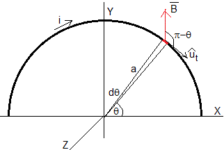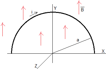 8.- Por un hilo semicircular de radio a circula una corriente de intensidad i. El hilo está en el seno de un campo magnético uniforme paralelo al eje Y,