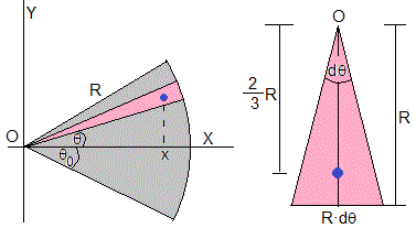 Dividimos el sector circular de ángulo 2θ 0 en sectores diferenciales de ángulo dθ (en color rosa), que podemos asimilar a triángulos isósceles de base R·dθ y altura R . El centro de masas de dichos triángulos se encuentra a 2R /3 del vértice.
