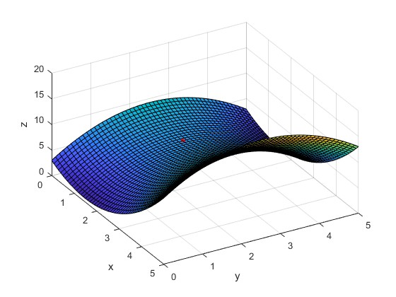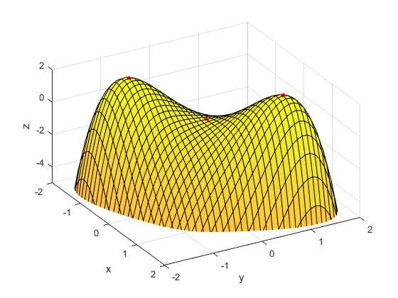 plot3(mx(k),my(k),f(mx(k),my(k)),'ro','markersize',4,'markerfacecolor','r')