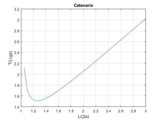 longitud=1.2:0.001:1.3; %la luz 2a=1 tension=zeros(1,length(longitud)); i=1; for l=longitud f=@(x) sinh(1/x)-l/x; T0=fzero(f,1); tension(i)=sqrt(T0^2+l^2); i=i+1; end [M,I]=min(tension); disp(longitud(I))