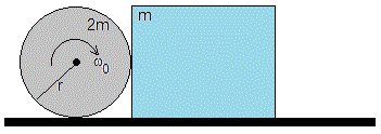 Un bloque de masa m que tiene una altura 2r, está en reposo sobre un plano horizontal. Un cilindro de masa 2r y radio r, está girando alrededor de su eje con velocidad angular ω0. En el instante inicial, t=0, se sitúa sobre el plano horizontal poniéndose en contacto con el bloque.