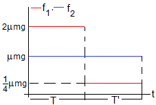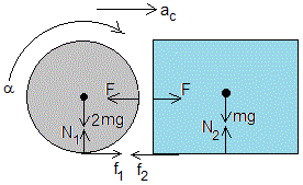 A partir de este instante, la velocidad del sistema disminuye, mientras se mantiene la condición de rodar sin deslizar del cilindro (ac=αr). En este caso, f'1 es una fuerza de rozamiento desconocida, menor que la máxima μ(2mg). Las ecuaciones del movimiento son