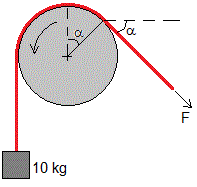 Supongamos que F=50 N, determinar el valor mínimo del ángulo α para que el peso de 10 kg no caiga.