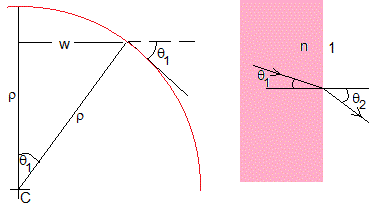 Dentro de la muestra, el haz de luz describe un arco de circunferencia de radio ρ y de longitud, aproximadamente, igual a w, el espesor de la muestra. El ángulo θ1≈w/ρ=w(dn/dy)/n.