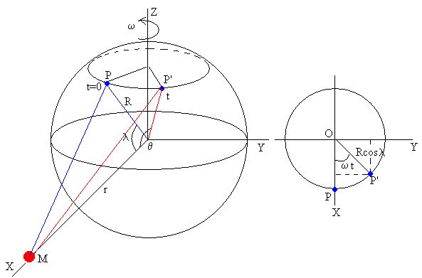 Supongamos que en el instante t=0, el punto P sobre la superficie de la Tierra a una latitud λ, y el cuerpo perturbador M están en el plano XZ. Al cabo de un cierto tiempo t, debido a la rotación de la Tierra, el punto P se habrá desplazado a la posición P’.