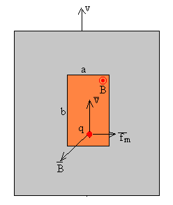 Supongamos que el campo magnético B es perpendicular al plano de la hoja metálica, al moverse la pieza metálica con velocidad v, los portadores de carga q existentes en la pequeña región rectangular de dimensiones a y b experimentan una fuerza fm=q(v×B), tal como se muestra en la figura. Los portadores de carga son impulsados por la fuerza magnética hacia la derecha.