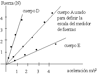 Podemos experimentar con más cuerpos y llevar los resultados a la gráfica de la Figura 2, en el eje vertical la fuerza y en el eje horizontal la aceleración, obtendremos líneas rectas. El hecho de que la fuerza es proporcional a la aceleración cuando diferentes fuerzas se aplican a un cuerpo, nos dice que existen un único número, una propiedad del cuerpo, que es la constante de proporcionalidad, y que le damos el nombre de masa (inercial). El hecho de que exista un único número para cada cuerpo no es una definición, ni se deduce de otros principios, es un hecho experimental.