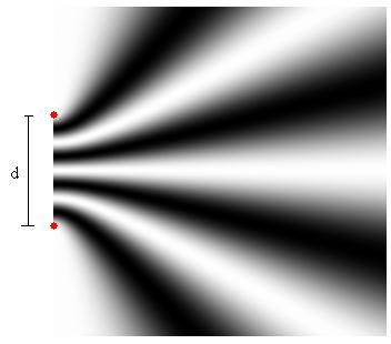 | En la figura, vemos la intensidad debida a la interferencia de las ondas producidas por dos fuentes sincrónicas separadas una distancia d, codificada en escala de grises. El color negro indica mínimo de intensidad y el color blanco máximo de intensidad. | |