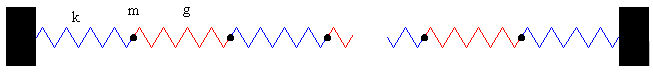 En esta página, vamos a calcular los modos normales de vibración de un conjunto de partículas de la misma masa m unidas por muelles elásticos de constantes k, g, k, g, … tal como se muestra en la figura