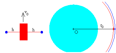 Irudiak erakusten du ontzia gorriz eta gorputz txikia urdinez. Kasu biak aztertuko ditugu: h positiboa denean, gorputza ontzia baino urrutiago dago Lurretik, eta h negatiboa denean, gorputza ontzia baino hurbilago dago Lurretik. Ezagutzen dira gorputzaren orbitaren distantzia minimoa (edo maximoa), r1=r0+h, eta bere abiadura toki horretan, v1=v0, eta aplikatzen bada momentu angeluarraren eta energiaren kontserbazioa orduan kalkula daitezke orbitaren distantzia maximoa (edo minimoa), r2, eta bere abiadura toki horretan, v2.