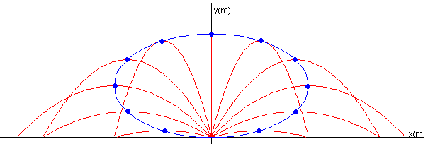 Eta hauxe da, hain zuzen, lehenago lortu dugun ekuazio bera, alegia, segurtasunezko parabolarena. Altuera maximoko puntuak lotzen dituen elipseaProiektilaren altuera maximoa lortzeko, baldintza hau ordezkatzen da: vy=0. Baldintza horri dagokion aldiunea hau da t=v0·sinθ/g. Eta proiektilaren posizioa une horretan hau da: (xh, yh)
