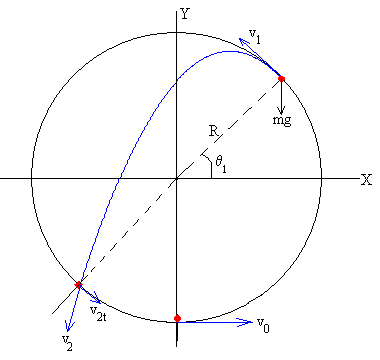 Teinkadaren eraginez, suposatuko dugu partikularen abiaduraren osagai normala ezabatu egiten dela eta partikulari osagai tangentziala baino ez zaiola geratzen. Ondoren osagai tangentzial horrekin abiatzen da berriro ibilbide zirkularrean. Abiaduraren osagai normala kalkulatzeko biderketa eskalar hau egin daiteke: r2·v2