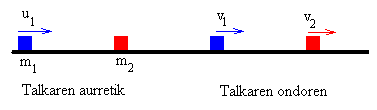 Demagun irudiak erakusten duen partikula-multzoa. Lehen partikula batek m1 masa du eta u1 abiadura. Bigarrenak m2 masa du eta hasieran geldi dago. Ondoren, bigarren partikula horrek hirugarren baten kontra talka egin dezake. Hirugarrena ere (m3) hasieran geldi dago.