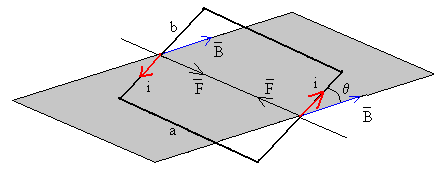 Irudian espira laukizuzen bat adierazi da; bere aldeek a eta b luzera dute, espirak plano horizontalarekin (grisa) q angelua osatzen du eta korronte elektrikoaren intentsitatea i da, gezi gorriak adierazten duen noranzkoaz. Espira eremu magnetiko uniforme batean murgilduta dago, B, horizontala, irudiko gezi urdinak adierazten duen bezalakoa. Eremu magnetiko horrek espiraren alde bakoitzari egindako indar guztiak kalkulatuko ditugu, banan banan. Eremu magnetiko batean korronte zuzen batek jasandako indarra-ren adierazpen matematikoa lehenago deduzitu dugu: