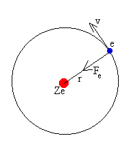 Zatiketa horrekin argi dago elkarrekintza grabitatorioa arbuiagarria dela elkarrekintza elektrikoarekin konparatuta. Bohr-en eredu atomikoaBohr-en eredu atomikoa oso sinplea da eta Copernicoren eredu planetarioaren antzekoa, alegia planetak eguzkiaren inguruan orbita zirkularrak deskribatzen. Elektroi batek ere atomo batean (edo ioi hidrogenoide batean) orbita zirkularrak deskribatzen ditu, baina erradioak ezin dira edozein izan. Demagun atomo bat edo elektroi bakarreko ioi bat. Nukleoak Ze karga du eta, masa handia duenez, geldi dagoela kontsidera daiteke.