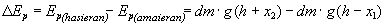 m1 lehen ontziko fluidoaren masa da eta m2 bigarrenarena. Masa-zentroak altueren erdian daude. (1) erlaziotik abiatuta eta masa berridazten bada (r dentsitatea bider bolumena), Ep energia potentziala adieraz daiteke x1 eta h-ren menpe: